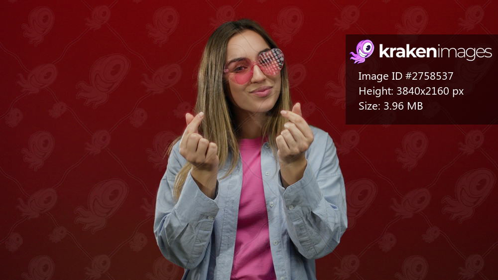 Woman making heart gesture wearing heart-shaped glasses with confident smile over red background isolated joyful female fashion pop art concept