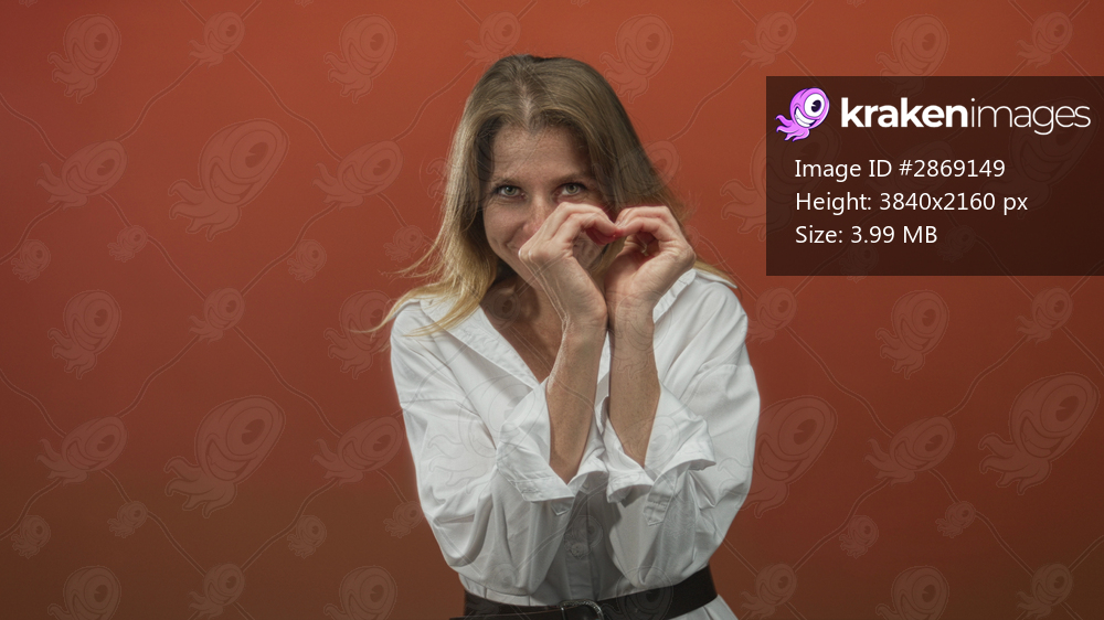 Woman making heart shape with hands near face in studio with orange backdrop wearing white shirt; affection.