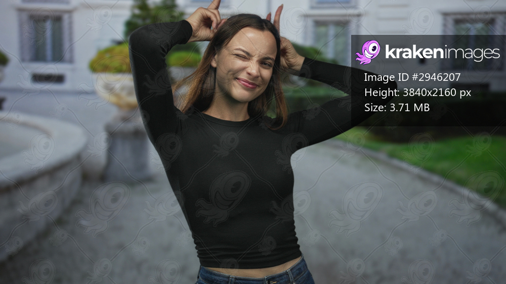 Woman making horns gesture with fingers on head in building courtyard, smiling with eyes closed wearing black top and jeans; playful confidence.