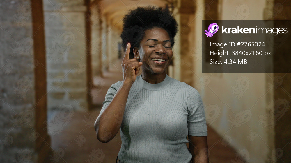 Woman making idea gesture in historic university corridor looks inspired with a thoughtful expression, wearing casual attire, showcasing creativity and intelligence. - Kraken Images