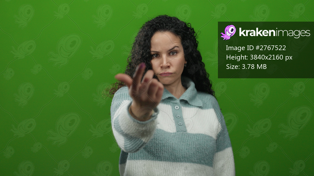 Woman making inviting gesture against green background, wearing striped sweater, expressing communication, hispanic descent, isolated over vibrant setting, youthful appearance.