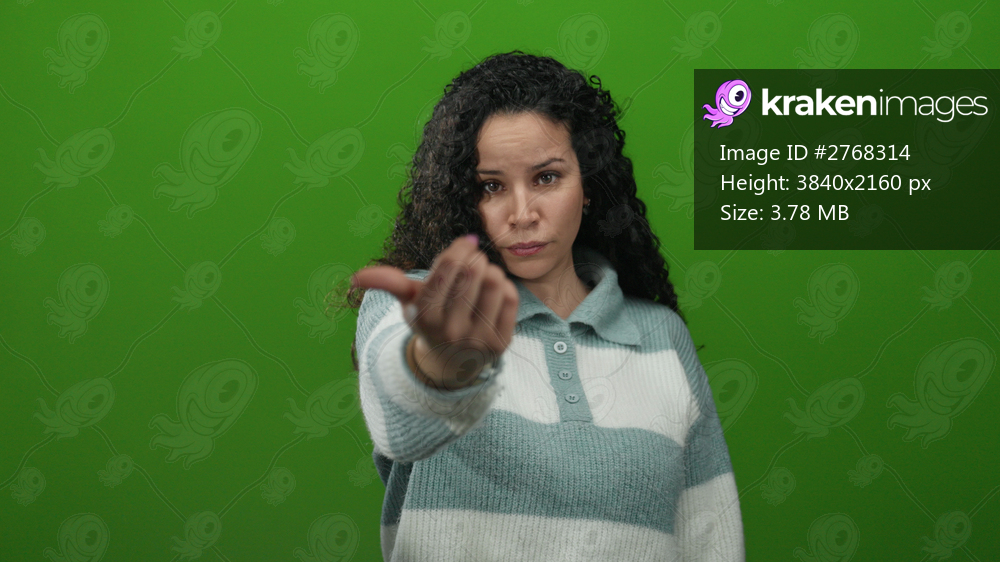 Woman making inviting gesture against green background, wearing striped sweater, expressing communication, hispanic descent, isolated over vibrant setting, youthful appearance.