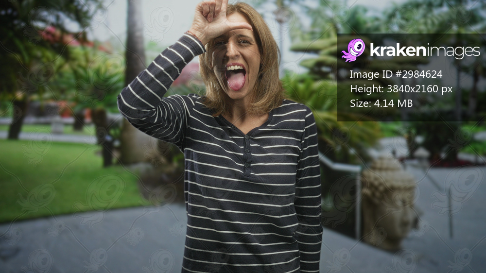 Woman making l sign with hand on forehead while smiling, wearing striped long sleeve shirt by a statue at a building entrance; playful mischief.