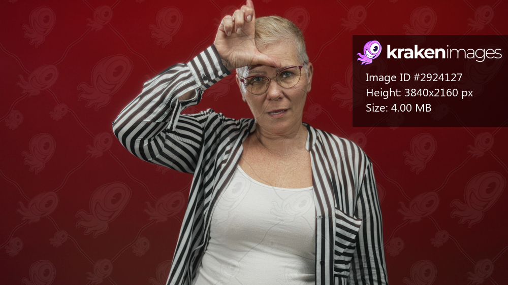 Woman making l sign with hand to forehead in red studio wearing striped shirt and glasses, white tank top; playful defiance.