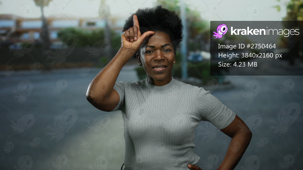 Woman making loser gesture outdoors in city street, african descent, confident expression reflects humor and irony in urban setting.