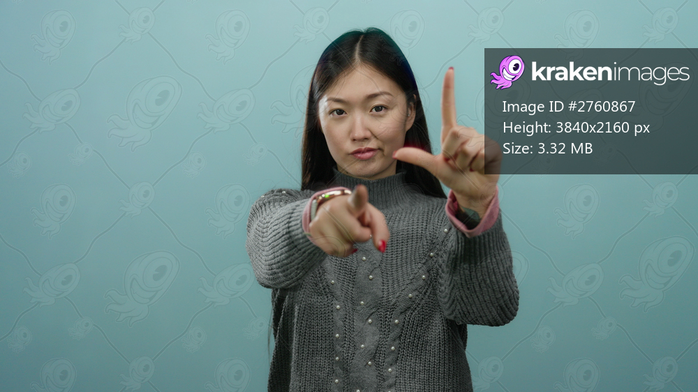 Woman making loser gesture over blue background, emphasizing youthful expression with sweater and hand movements, drawing focus on female expression and isolated setting. - Kraken Images