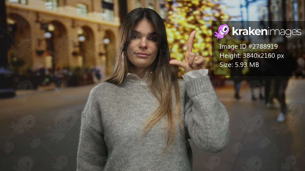 Woman making loser gesture standing on urban street with holiday lights wearing sweater during winter evening in vibrant cityscape