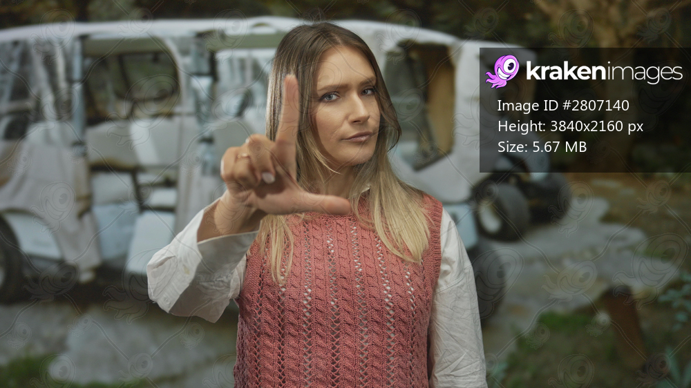 Woman making loser sign standing in park showing blonde hair and serious expression with golf cart in background on outdoor sunny day.