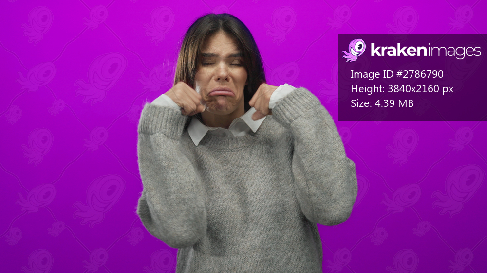 Woman making mock crying gesture wearing gray sweater against vivid pink background suggesting humorous playful emotional expression.
