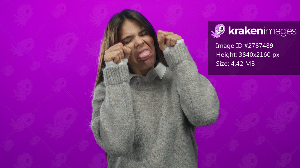 Woman making mock crying gesture wearing gray sweater against vivid pink background suggesting humorous playful emotional expression.