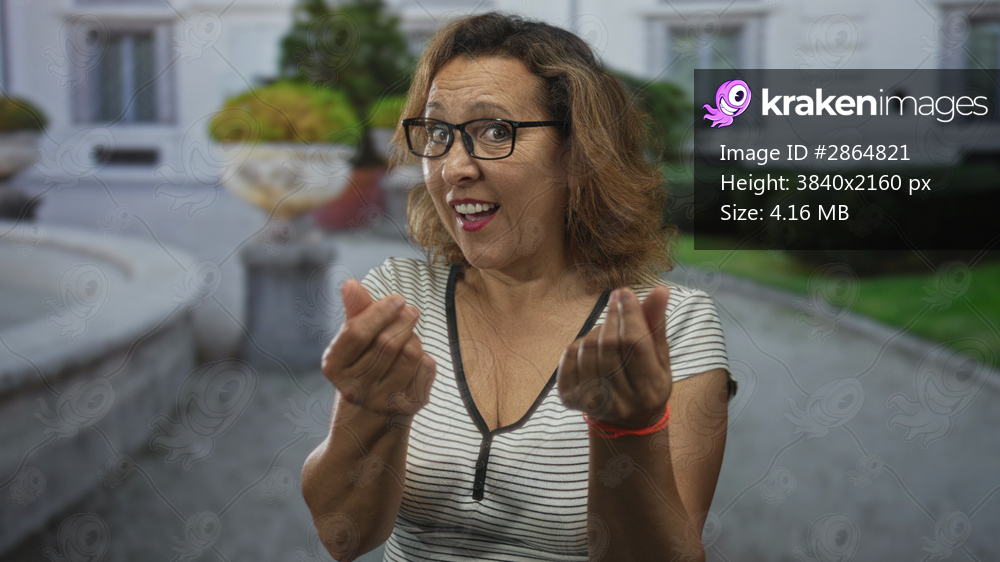 Woman making money gesture with hands by a fountain in front of a building outdoors, smiling and wearing glasses; playful request.