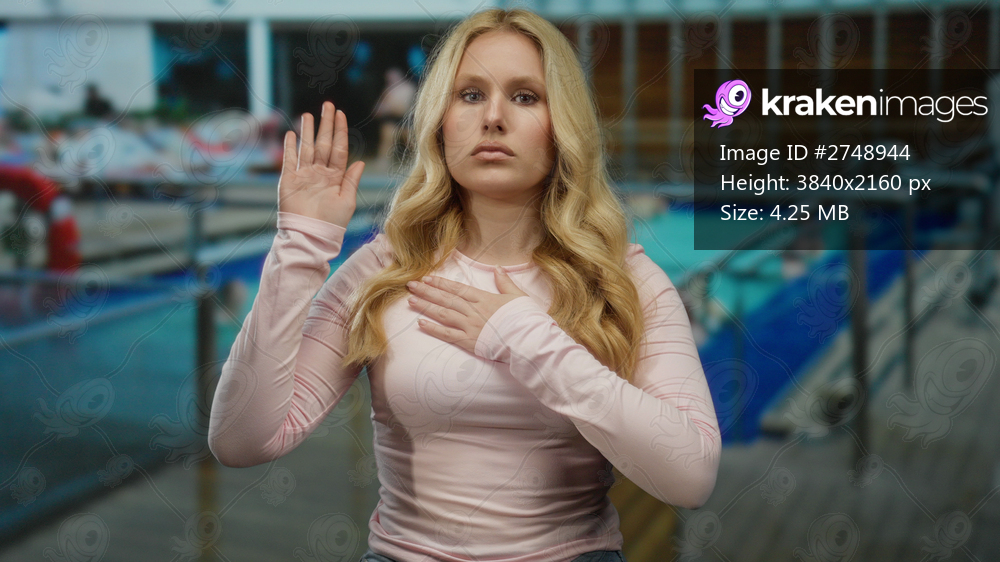 Woman making oath gesture on cruise ship with blonde hair in casual attire, indicating commitment while standing on deck with pool in background, expressing sincerity and trust. - Kraken Images