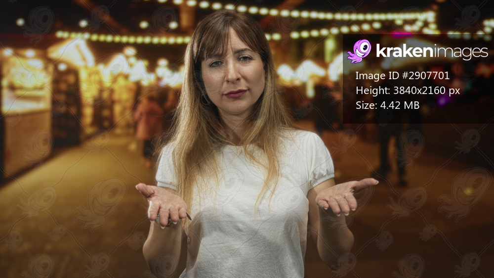 Woman making ok hand gesture with closed eyes near softly lit market stalls on street at night; contentment.