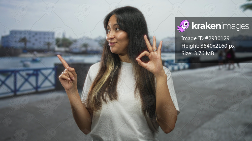 Woman making ok hand sign and pointing finger on a street promenade by the seaside; cheerful approval.
