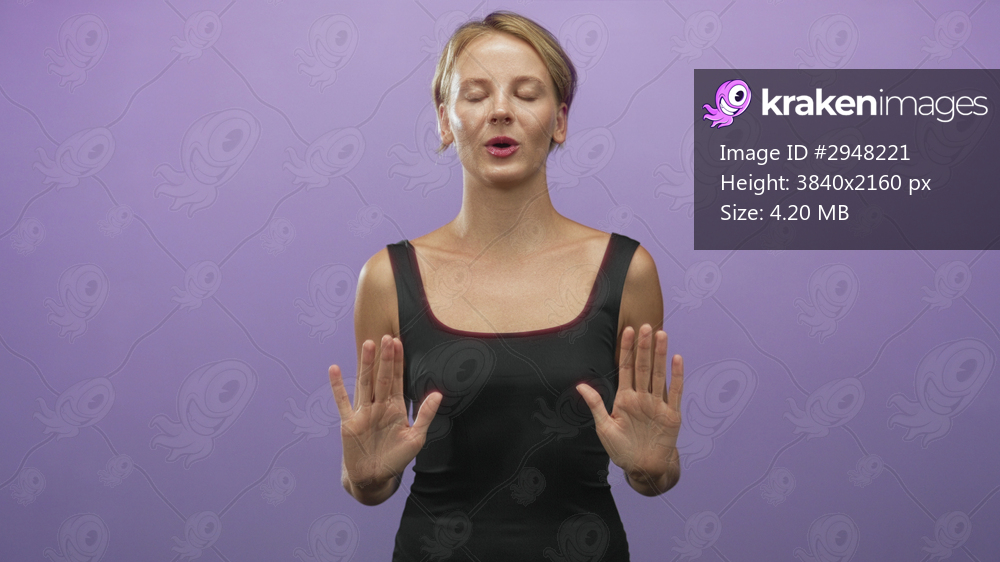 Woman making ok and open palm gestures with bare hands visible, wearing black tanktop in studio purple backdrop; calm focus mindfulness.