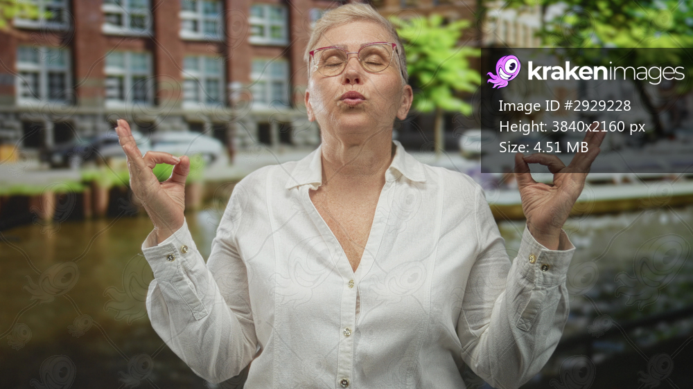 Woman making ok sign with both hands, eyes closed and puckered lips, glasses visible beside a canal on amsterdam street with brick buildings; mindfulness calm. - Kraken Images