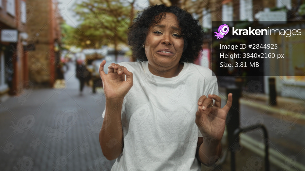 Woman making ok sign with fingers and hands on a city street outdoors while grimacing and recoiling; unease.