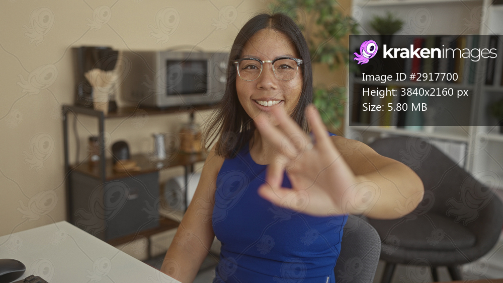 Woman making ok sign with hand in office building, wearing blue dress and glasses while seated at desk near shelf and chair; supportive approval.