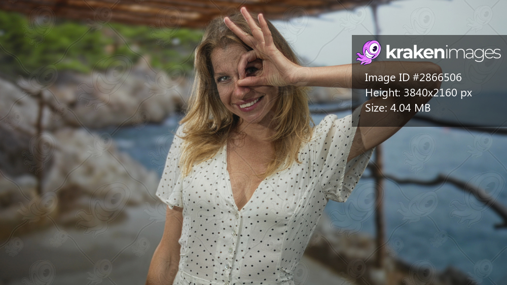 Woman making ok sign with hand over eye on rocky beach in white polka dot dress; playful summer escape.