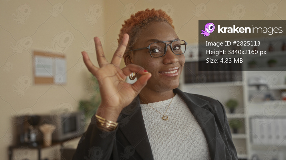 Woman making ok sign with hand and smiling at camera in office with shelves; confidence trust success achievement.