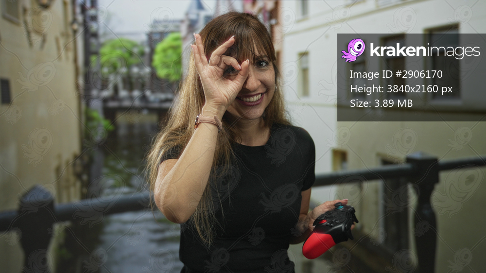 Woman making ok sign with hand while holding red gamepad on building railing overlooking canal; playful gaming.