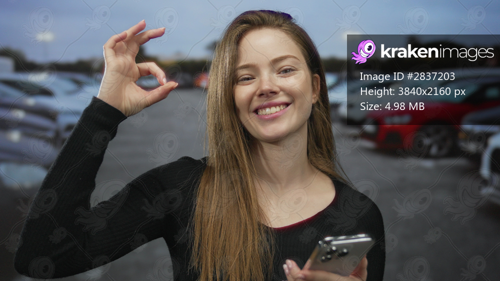 Woman making ok sign with hand while holding smartphone on street under evening sky before parked cars; confidence positivity.