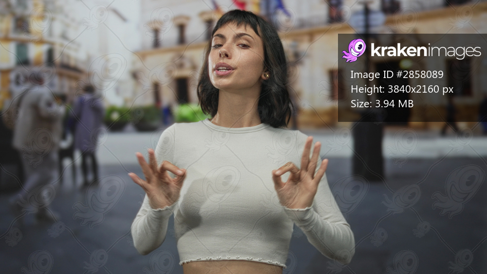 Woman making ok sign with her hands and pursed lips on a sunny street beside ornate building facade; approval.