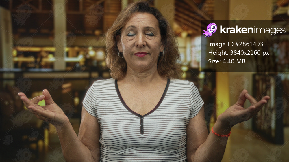 Woman making ok sign with raised hands while closing her eyes in a hotel building lobby wearing striped shirt; serenity.