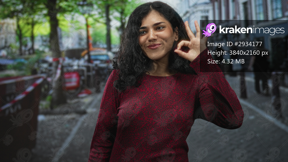 Woman making ok sign with right hand on green tree lined street by buildings and bicycles; confidence.