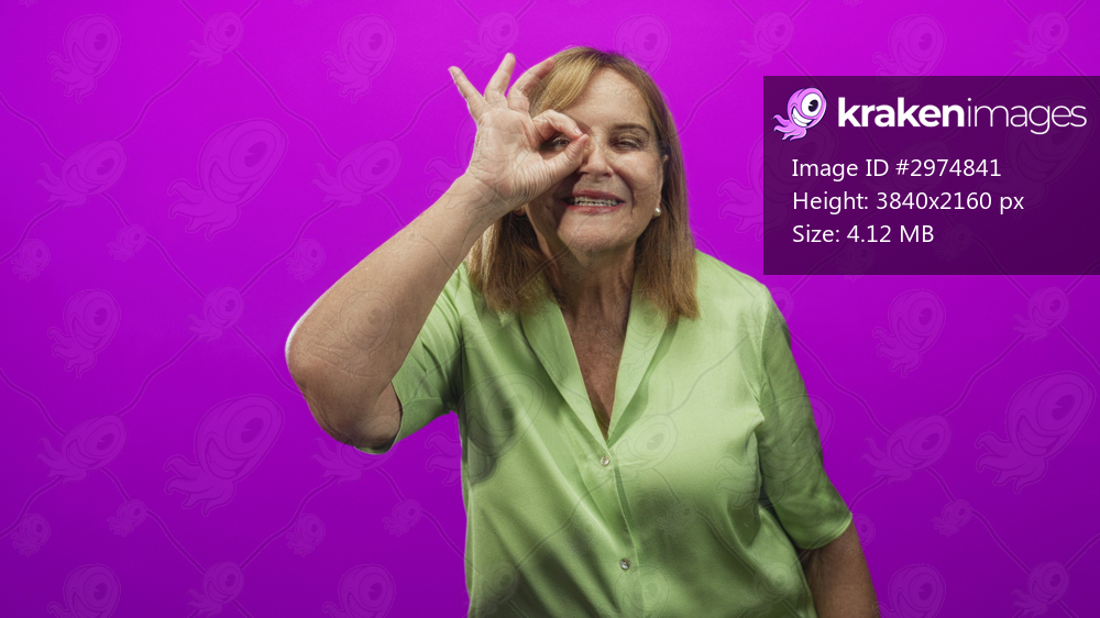 Woman making ok sign with right hand over eye, mouth rounded in a pose, wearing light green blouse in studio with magenta backdrop; playful curiosity.
