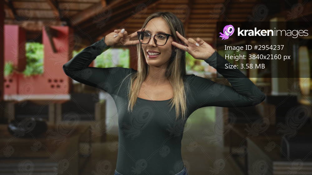 Woman making peace sign by eyes while smiling, wearing glasses and fitted top in hotel building; playful joy.