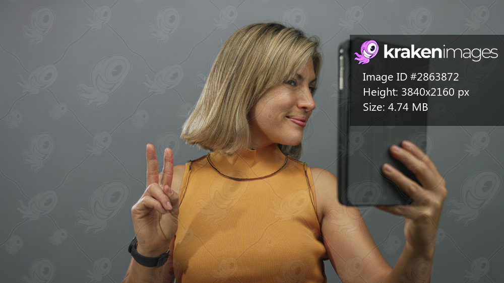 Woman making peace sign gesture with tablet front camera in a gray studio setup capturing digital selfie moment; confidence.