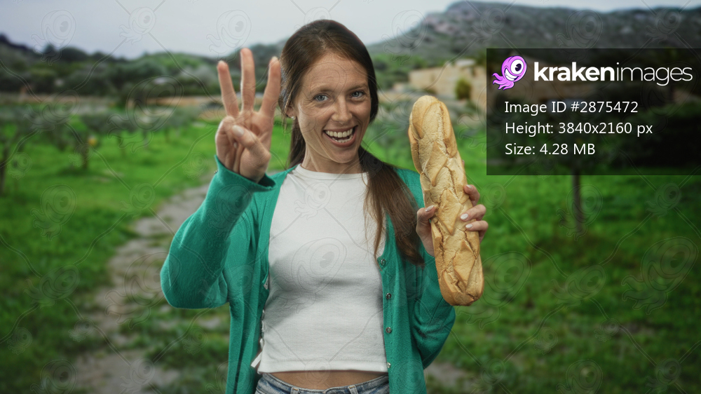 Woman making peace sign with hand while holding a baguette in a field near a stone building; serenity.