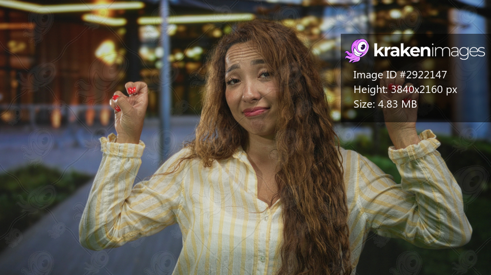 Woman making peace signs with both hands in front of a lit urban building at night, visible red nails and long hair; playful confidence.