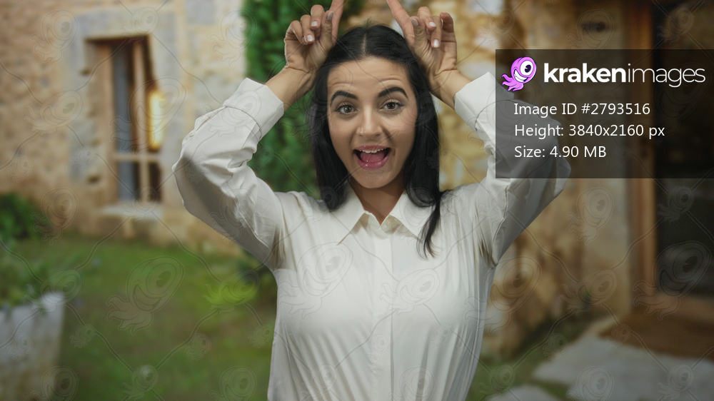 Woman making playful gesture with hands on head, smiling outdoors on a sunny day, wearing white shirt, in a rustic stone street backdrop, capturing hispanic youthful joy and spontaneity. - Kraken Images