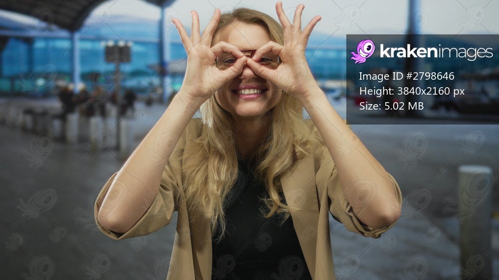 Woman making playful glasses gesture with her hands, smiling outside an airport, blue sky in the background, capturing a fun and carefree travel moment. - Kraken Images