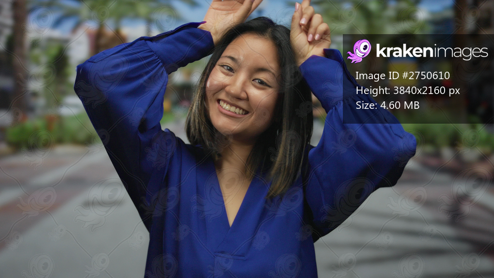 Woman making playful horns gesture in blue blouse while smiling outdoors on a city street with palm trees in the background capturing a cheerful urban vibe. - Kraken Images