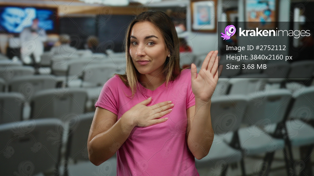 Woman making pledge gesture in art gallery setting wearing pink shirt surrounded by various artworks and empty chairs, conveying an indoor atmosphere in a public space. - Kraken Images