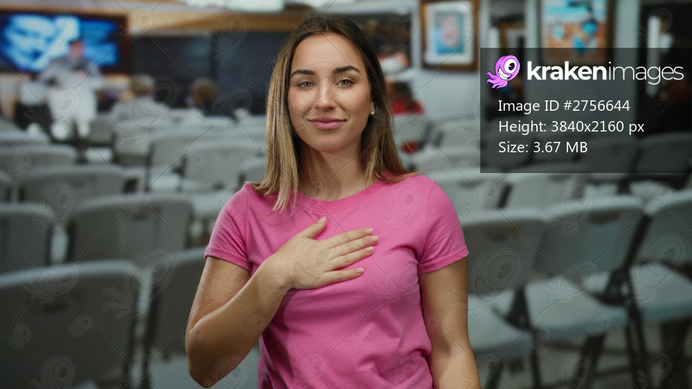 Woman making pledge gesture in art gallery setting wearing pink shirt surrounded by various artworks and empty chairs, conveying an indoor atmosphere in a public space. - Kraken Images