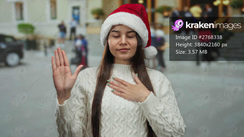 Woman making pledge gesture in santa hat and white sweater outdoors on bustling city street, showcasing holiday spirit and sincerity.