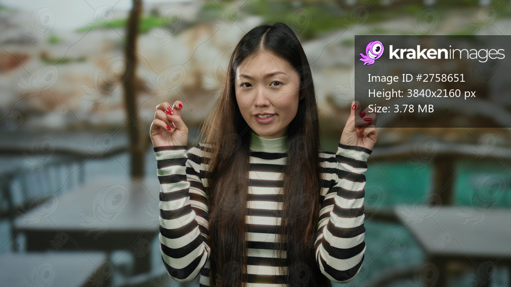 Woman making quotes gesture with fingers on seaside with blurred background wearing striped shirt outdoor scene.