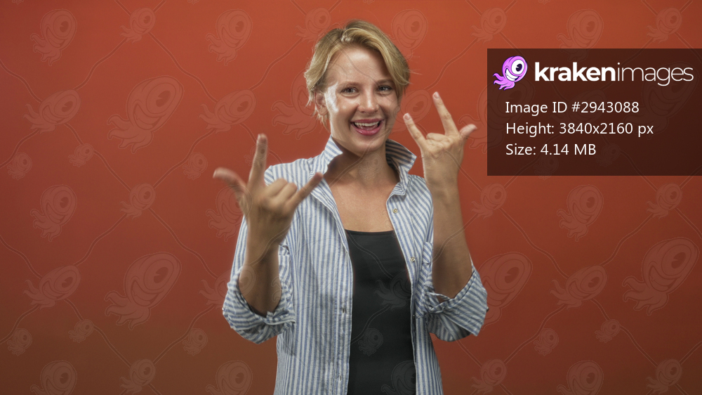 Woman making rock hand gesture in orange studio, both hands raised showing horns, striped shirt over black tank, smiling and eyes closed; playful joy.