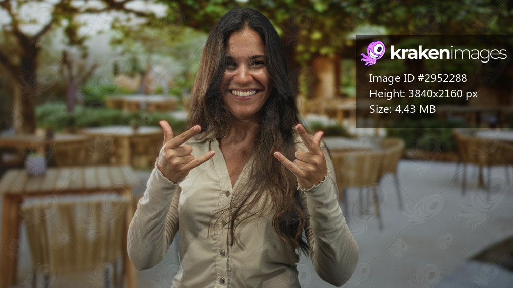 Woman making rock horns with both hands on a restaurant terrace near a building; playful energy celebration confidence.