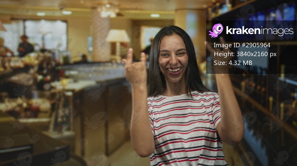 Woman making rock horns gesture with both hands inside a restaurant building, smiling broadly; playful.