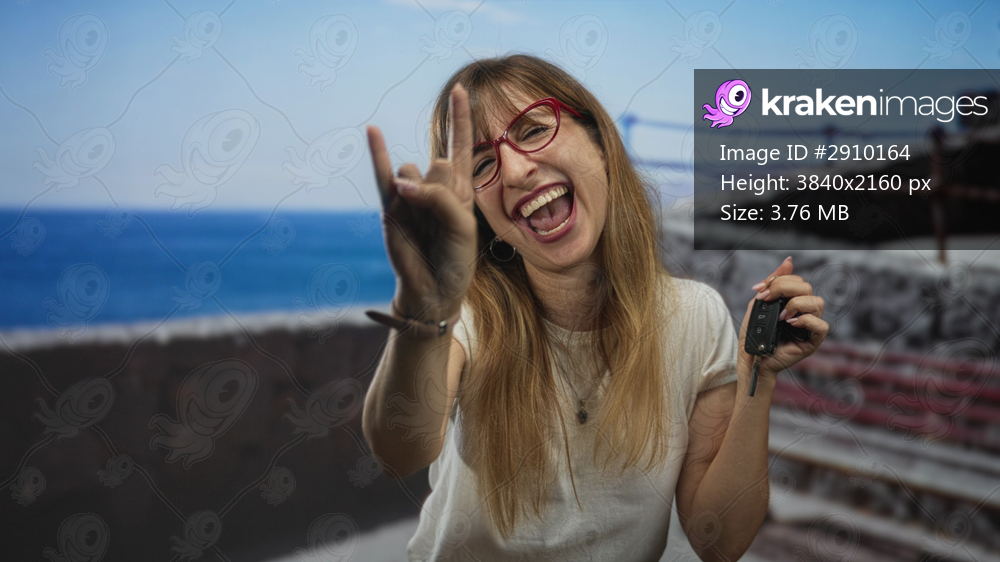 Woman making rock horns gesture while holding car keys on seaside bench and railing; joy travel fun.