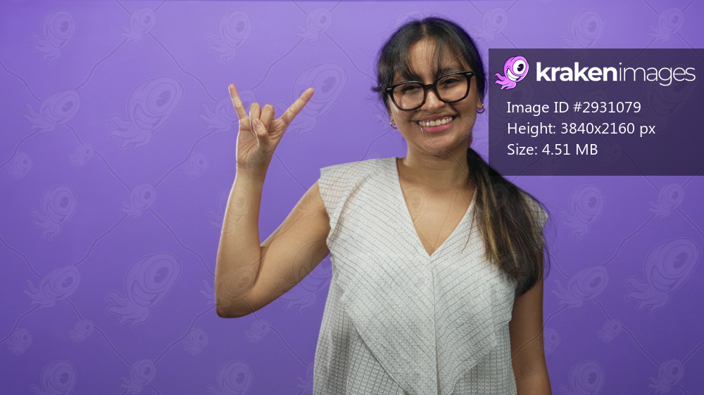 Woman making rock horns hand gesture with raised hand, wearing glasses and white top in purple studio; joyful energy.