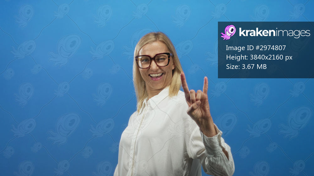 Woman making rock horns with hand and winking, wearing glasses and white shirt in studio against blue backdrop; joy playfulness.