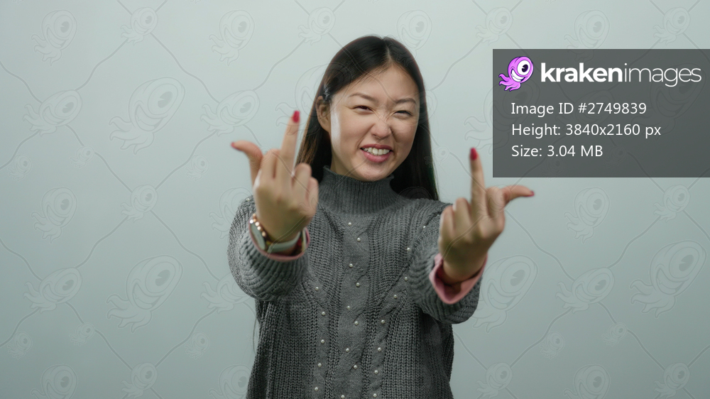 Woman making rude gesture with both hands on white background expressing defiance and attitude with playful expression in casual attire.