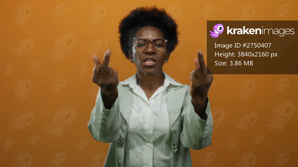 Woman making rude gesture with both middle fingers raised on an isolated orange background, expressing frustration and defiance with an intense facial expression in a professional outfit. - Kraken Images