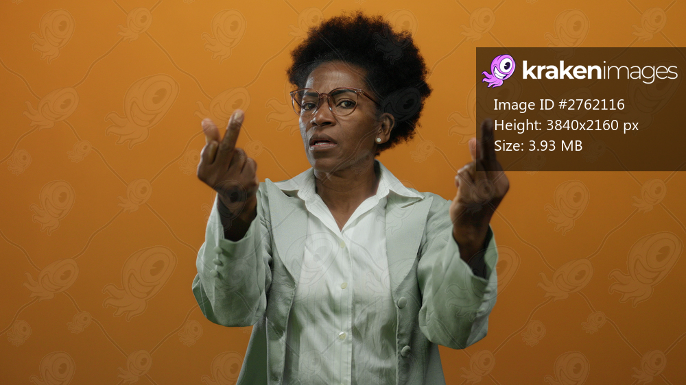 Woman making rude gesture with both middle fingers raised on an isolated orange background, expressing frustration and defiance with an intense facial expression in a professional outfit. - Kraken Images